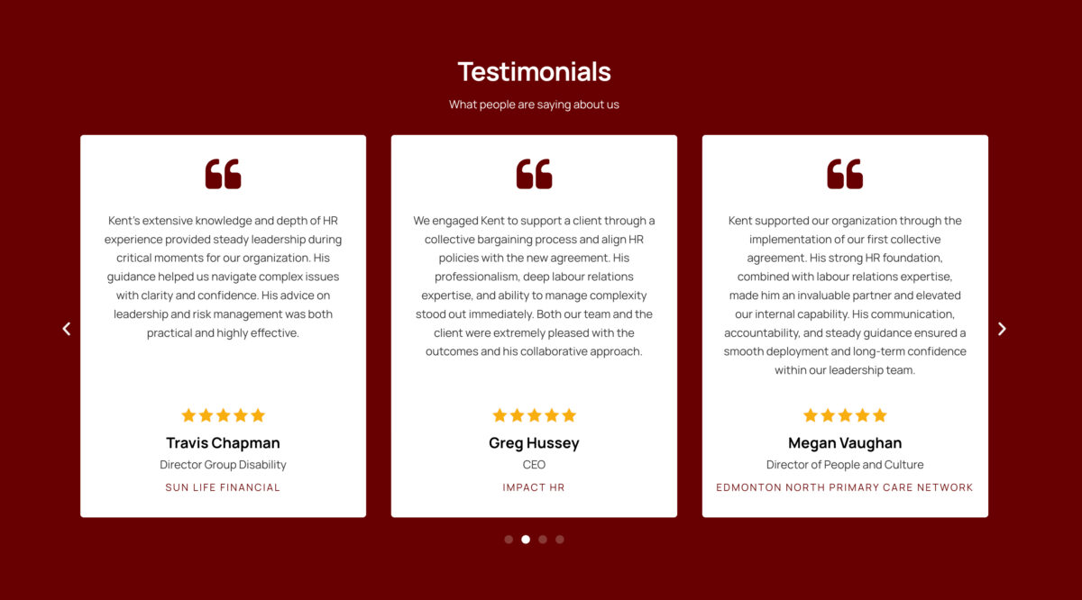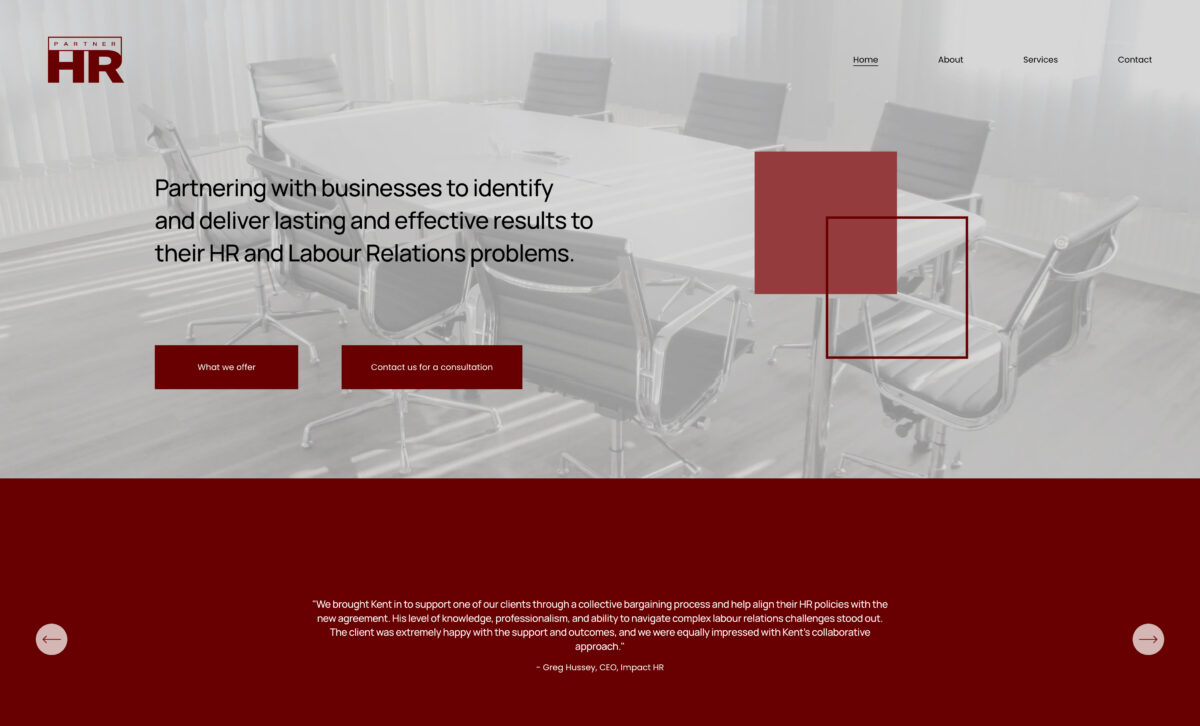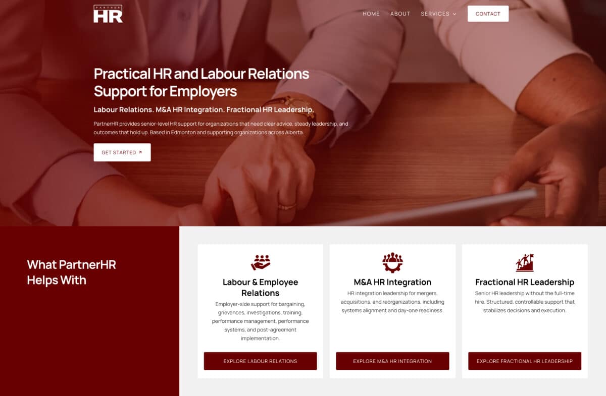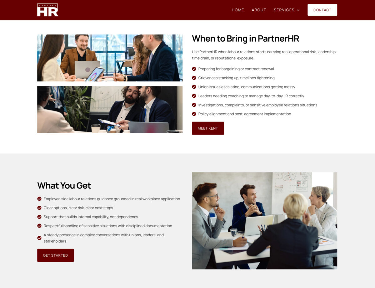 For a consultant operating at a senior advisory level, this created a credibility gap. Prospective clients—particularly larger organizations dealing with labour disputes or post-acquisition integration—need confidence immediately. The site did not reinforce that confidence.
